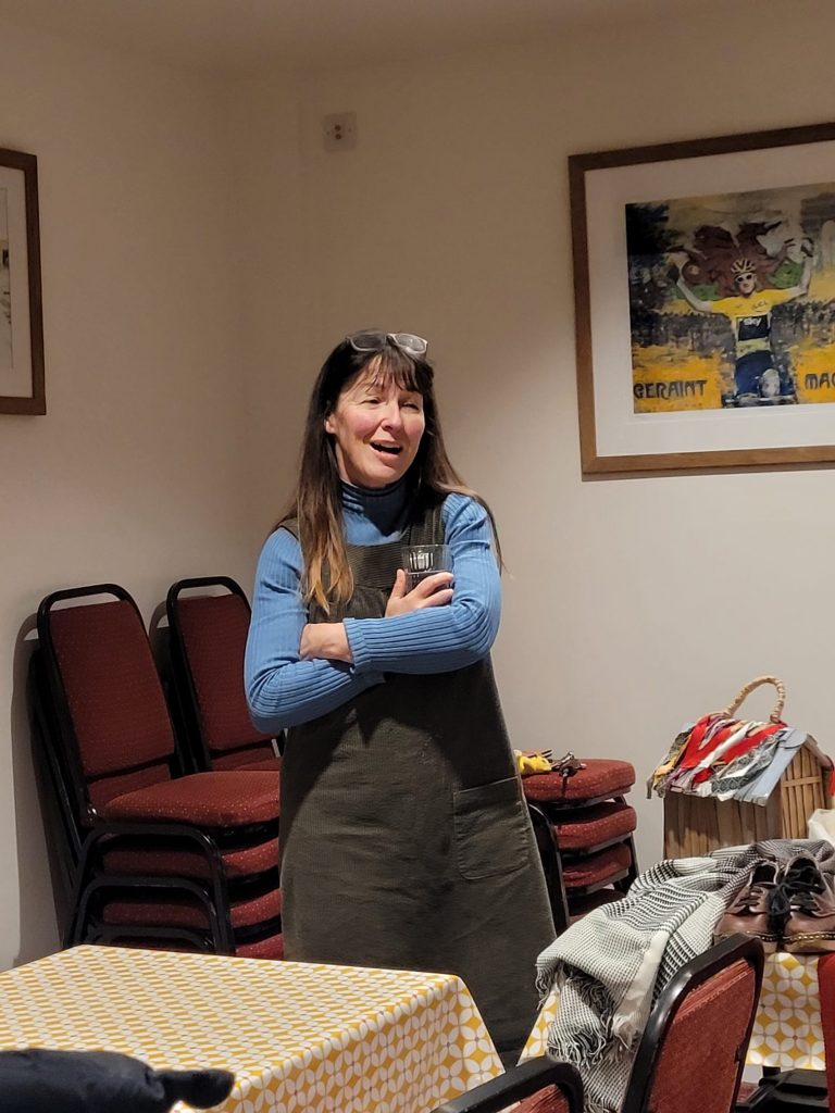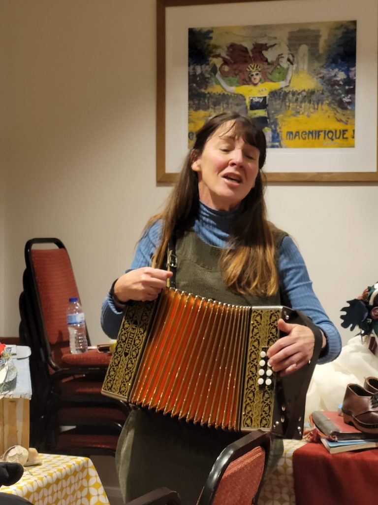 Daeth â llawer o waith crefft i’w harddangos, – gwaith roedd hi ei hunan wedi ei greu, sef penglog y Fari Lwyd, tŷ’r dryw bach a model o hen fwthyn. Cawsom hanes a chlywed gwaith y bardd Idwal Lloyd, a chlywed  geiriau i’r gân sy’n gysylltiedig â’r Fari lwyd. Bu’n sôn am hela’r dryw, a’n diddori â chân am Geiliog Beti gyda help y ‘squeeze box’. Adroddodd ran fawr o’r gerdd Pwll Deri gan Dewi Emrys, sydd fel gwaith Idwal Lloyd, wedi ei hysgrifennu yn y dafodiaith leol.  Hefyd cyflwynodd ychydig o hanes y cymeriad o Wdig,  Shemi Wad (James Wade) y storïwr celwydd golau enwog bu fyw yn ystod y bedwaredd ganrif ar bymtheg. Un o hoff bethau Shemi oedd cnoi baco a sefyll rhwng y ddau dafarn yng Ngwdig yn adrodd storiâu i bobol oedd ar fin mynychu’r tafarn, mewn gobaith y cai ddiod am ddim am ei stori.